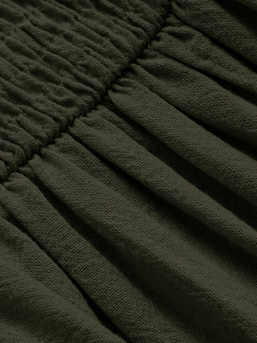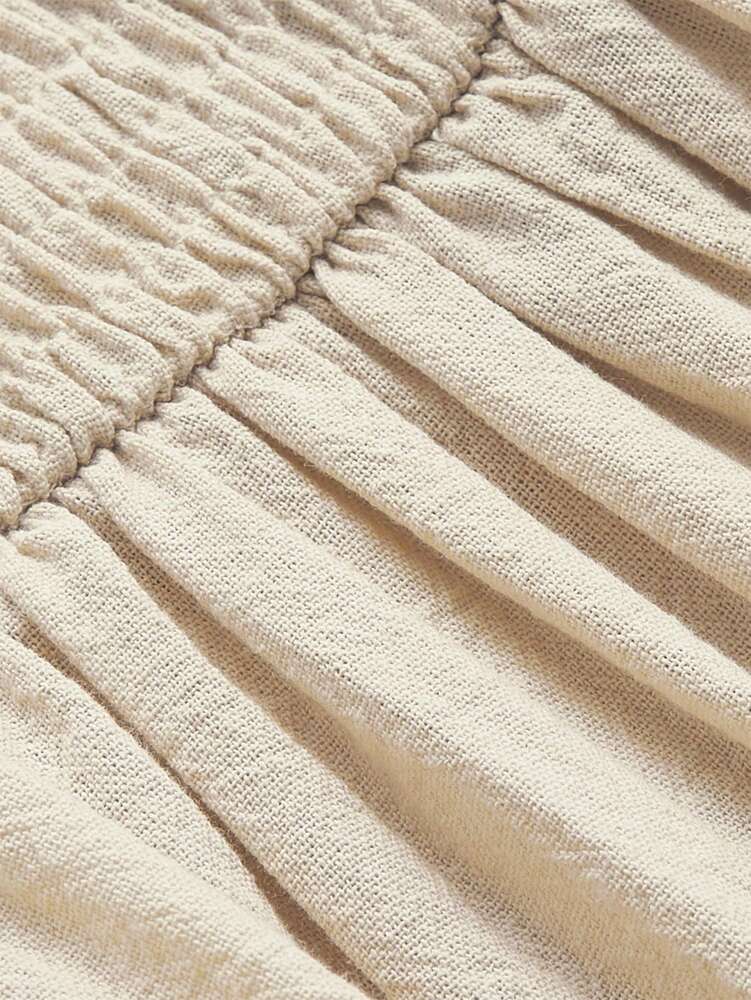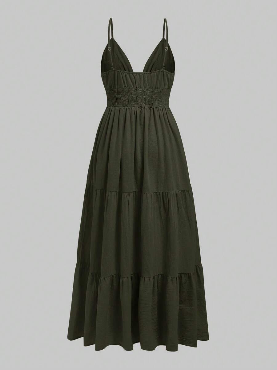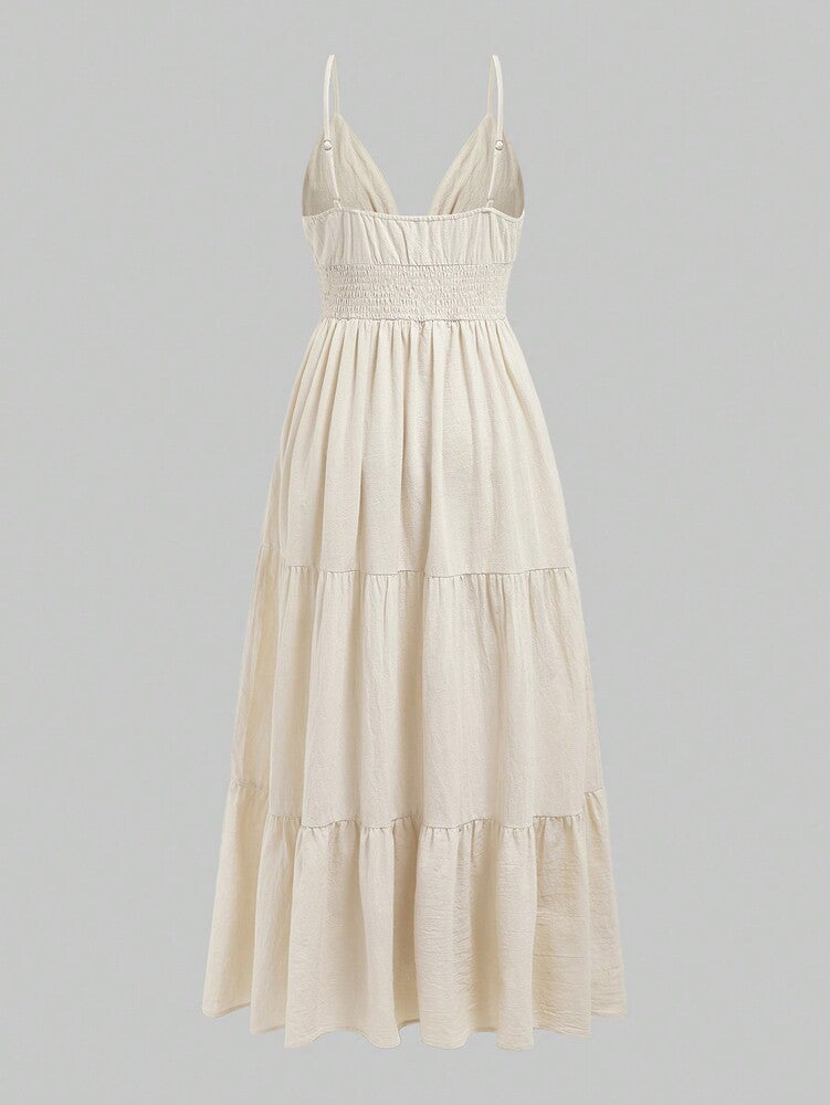 This long, beige boho-style dress features a high waist and layered tiered hem, crafted from 100% woven cotton for breathability and comfort. Its spaghetti straps, knot detail, ruffle hem, and shirred bodice create a romantic, loose fit ideal for Ramadan, Eid al-Adha, and Eid al-Fitr celebrations. The floral and polka dot pattern adds a delicate touch without stretch or lining. Easy to care for with machine wash instructions, it offers an elegant yet casual option for festive occasions or vacation wear.